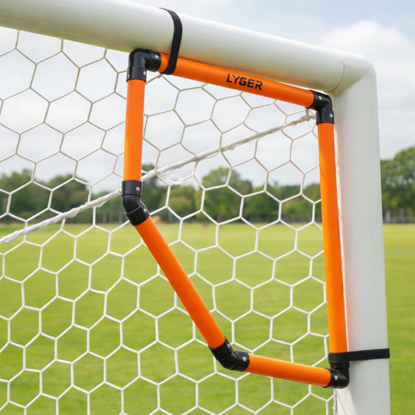 The classic penalty corner target is made of high impact resistant PVC tubing and can be easily attached to any standard football goal with the additional velcro straps. Available in 2 sizes.